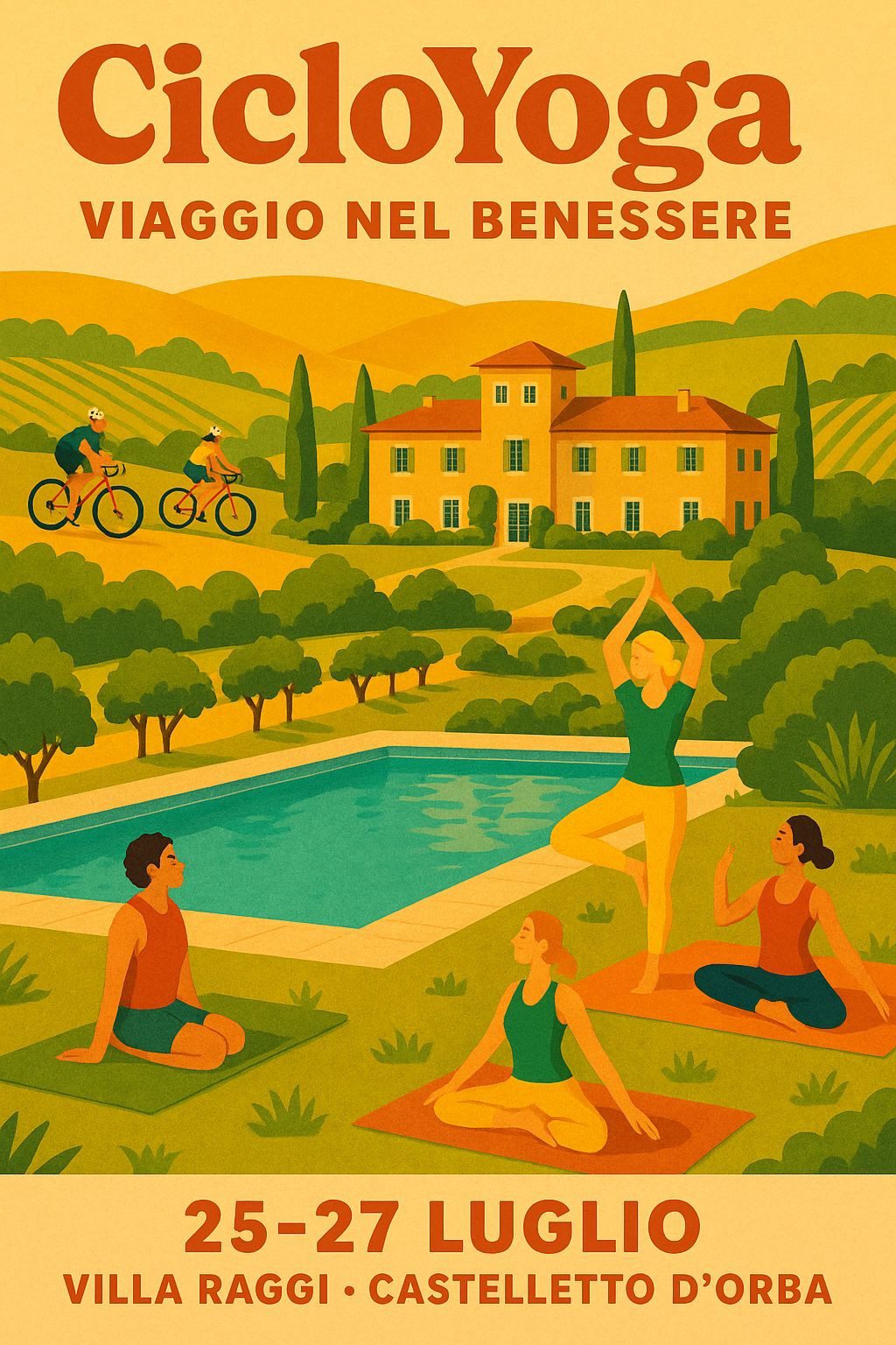 Venerdi’ 25 Luglio arrivo presso la location Villa Raggi relax in piscina e apericena pernottamento Sabato 26 Luglio dopo la prima colazione mattina a disposizione per relax in piscina o attivita’ alternative a richiesta (quotate a parte) Sabato pomeriggio: ritrovo con la guida cicloturistica certificata per un giro in bici gravel o e-bike su strade secondarie e sterrate, tra filari e i panorami collinari intorno a castelletto d’orba. Al rientro: sessione di yoga all’aperto nel parco di villa raggi, seguita da apericena con degustazione di vino e birra artigianale del birrificio exuvia di campoligure (fino a 3 birre in assaggio!) Domenica 27 Luglio Domenica mattina: yoga all’alba, colazione e seconda pedalata nella natura. Al rientro aperipranzo e check-out e’ possibile partecipare a una sola giornata (sabato o domenica) oppure vivere l’esperienza completa possibilita’ di soggiornare solo a partire da sabato noleggio e-bike disponibile su richiesta Per informazioni e prenotazioni: travelconsulting srl – via cairoli, 63 ovada (al) tel :379-1565842 – mail : booking@travelconsulting.it